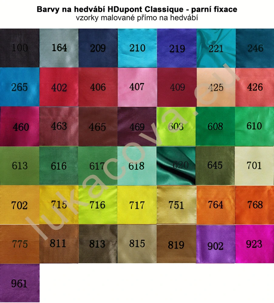 Profesionální napařovací barvy pro malbu na hedvábí a vlnu řady H.DUPONT® CLASSIQUE - fixace párou. Těmito výraznými, živými, vysoce koncentrovanými barvami lze malovat např. konturovou technikou po předchozím zafixování kontury a následném propaření suchou párou nebo batikovat ve vlhkém stavu v mikrovlnné troubě. Po dokonalém zafixování vynikají výbornou stálostí. Oproti barvám s fixací teplem zůstává v tomto případě hedvábí hebké a lesklé. Barvy lze použít i na obarvení vlny či jiných vláken živočišného původu.